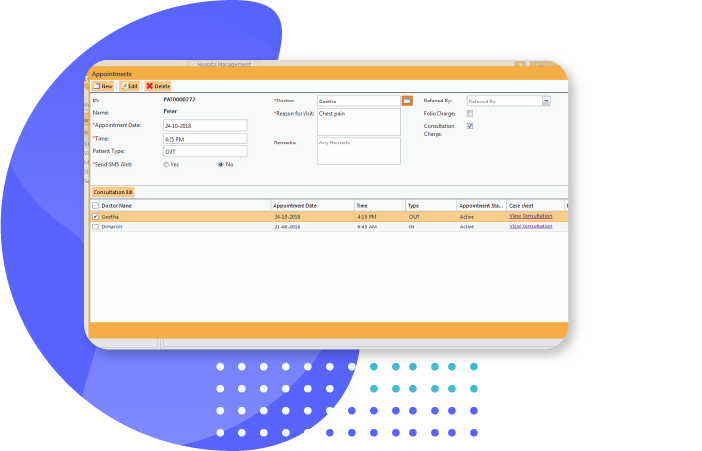 Provides automatic posting of charges related to different services like bed charges, lab tests conducted, medicines issued, consultant's fee, food, beverage and telephone charges etc. Furthermore the charges for various services rendered can be recorded through service module and this can be used for billing purposes.