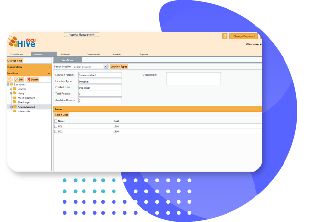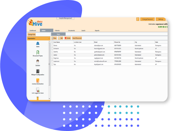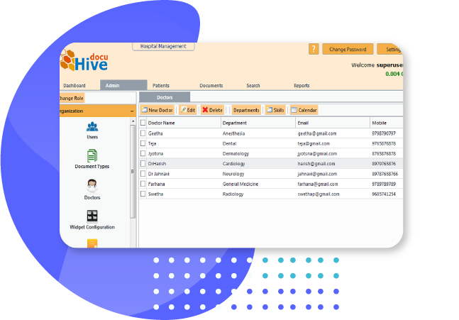 The Admin module have controls for creation of users, skills, doctors, widget info etc. Assigning roles to the users respectively that would be helpful in using the rest of the application. We can also track the logged in users information and can create services offered as of need. Also providing license information and control of different document types creation which is used in documents module for easy accessing of patient reports. User roles and permissions would be assigned to provide security within the application.